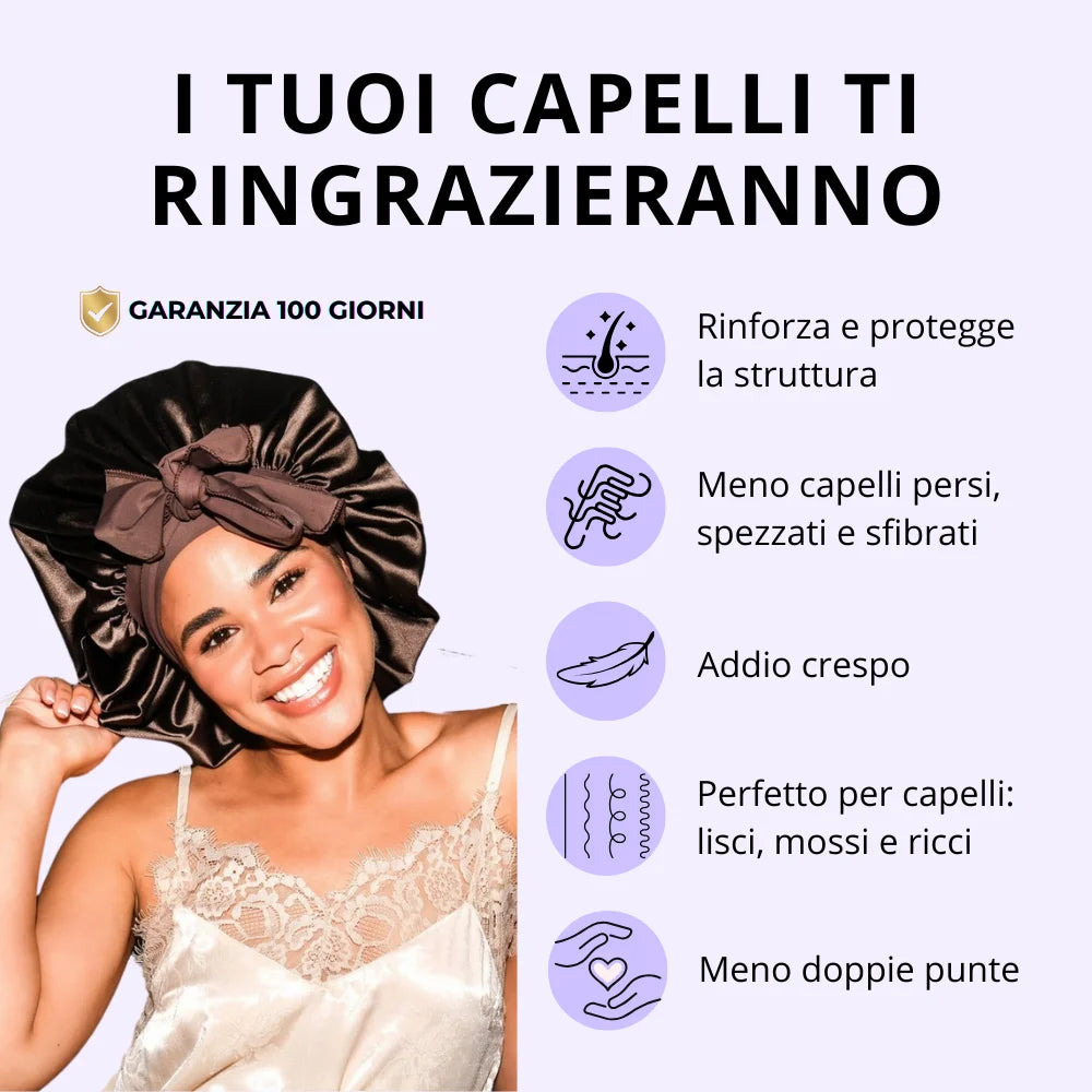Dì addio a crespo, doppie punte, capelli spezzati e rovinati. Il nostro bonnet mantiene i capelli protetti tutta la notte, assicurando un risveglio con capelli luminosi, morbidi e senza nodi.